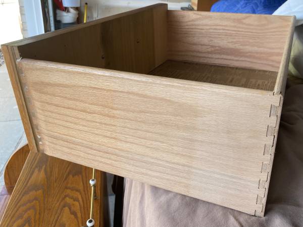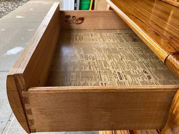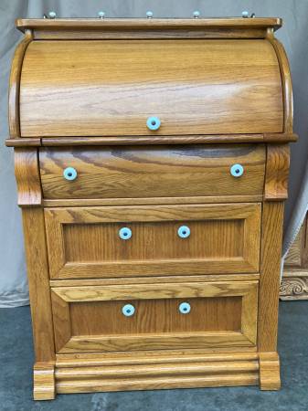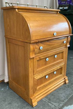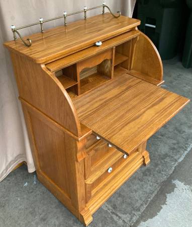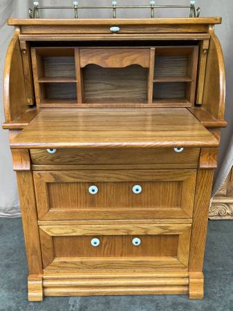 Compact Roll top desk constructed with solid oak and oak veneers. This is a heavyweight, solid and sturdy desk by Pulaski. Measures 29” x 19” x 39.5” tall, 42.5” with top decorative rail. Includes 3 drawers with solid wood dovetail construction, 5 cubbies and a large pull out writing / laptop surface. Barrel Roll top opens and closes smoothly. American Oak finish has been enhanced with beeswax and Citrus oil. Overall an excellent piece for students, home office or small business. $175 with pick up in Apple Valley.