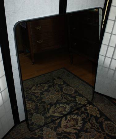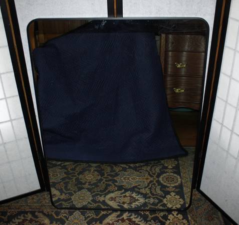 *) Classy Metal Rounded Rectangle Wall Mirror 40 x 30 – black frame color. An ultra-thin mirror iron frame with rounded edges encasing a flat glass surface that bounces natural light around to brighten your space. In Excellent Condition. Dimensions: 40" tall, 30" wide, 1" deep. $65