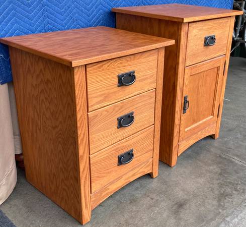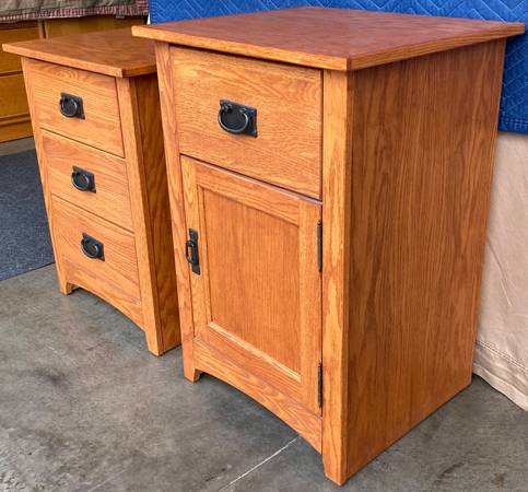 Mission Oak nightstands / end tables are in very good to excellent used condition. Constructed with solid Oak and Oak plywood with a red oak finish. All drawers slide easily on ball bearing slides with safety stops. The 3 drawer measures 20.25” x 17.5” x 26.5” tall. The single drawer, single door cabinet measures 20.25” x 17.5” x 29.5” tall and has one adjustable shelf. Quality built pair for $350 with pick up in Apple Valley / Lakeville area. $200 each if sold separately.