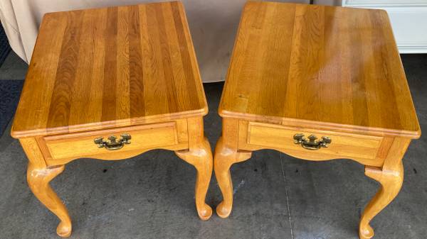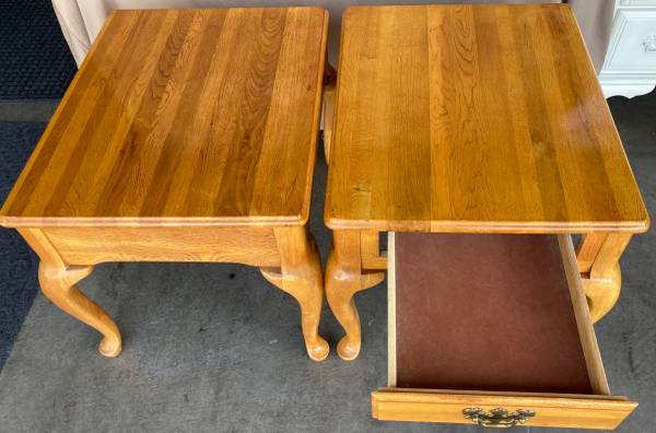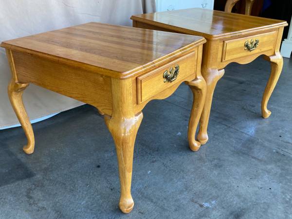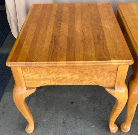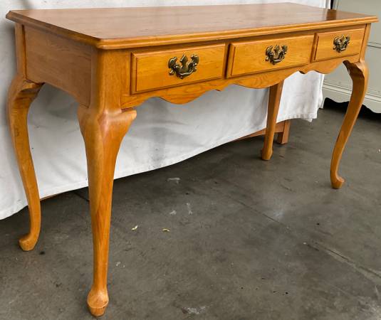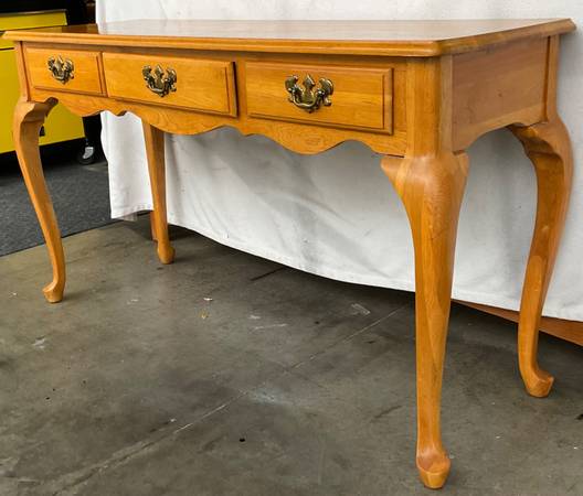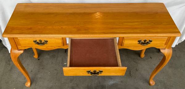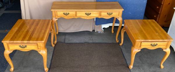 Matching Solid Oak Queen Anne tables are in very good used condition. Sofa / Hallway / Entryway table measures 48” x 16” x 27” tall. Includes 3 solid wood felt lined drawers. The pair of single drawer end / side tables / nightstands measure 21” x 26” x 21” tall. The American oak finish has typical very minimal wear and has been polished with beeswax and Citrus oil. Beautiful tables with wonderfully curvy Queen Anne legs, solid and sturdy. $300 for the set or $125 each with pick up in Lakeville.