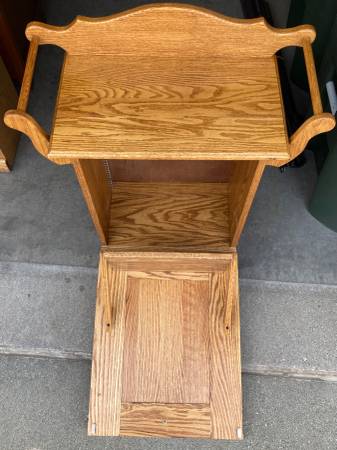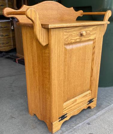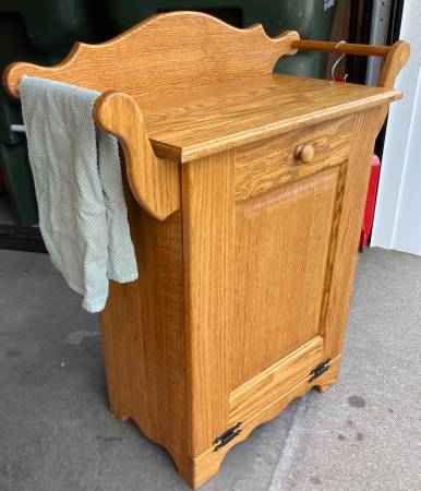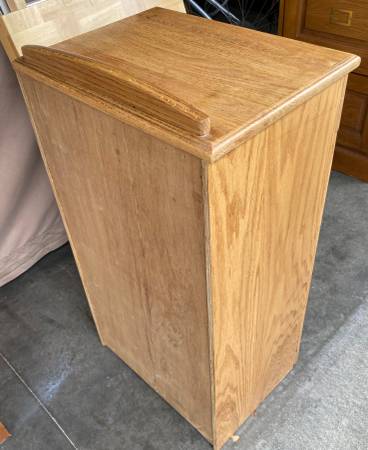 Oak tilt out Cabinet Bin in good used condition. Recently cleaned and lightly sanded the Honey oak finish. It has been renewed with Orange oil. Measures 28.5” wide x 13.25” deep x 33.25” tall. Includes standard container for trash, recycling, laundry or ????. Perfect for kitchen, pantry, laundry, mudroom or bathroom. Constructed of solid oak. $140 with pick up in Lakeville / Apple Valley.