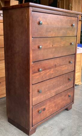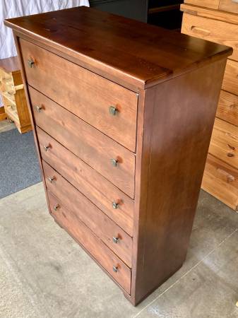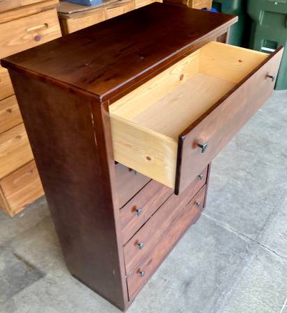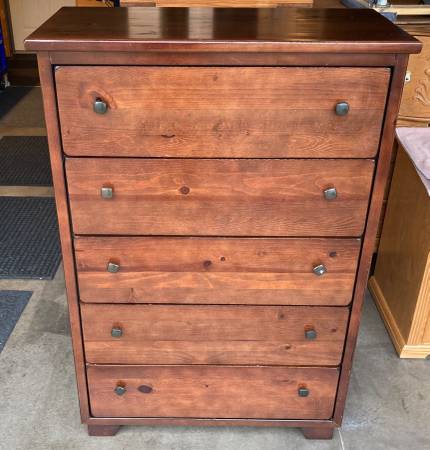 Solid Pine wood 5 drawer Highboy dresser chest is in very good used condition, solid and sturdy. Measures 35” x 17” x 52” tall. All drawers slide smoothly on updated Kenlin slides and have solid wood construction. Dark pine finish is in overall great condition with some designed distress. Top has been lightly sanded and an application of Old English, beeswax and citrus oil has been applied, looks wonderful. Great storage chest with that great Up North look and feel. $225 with pick up in Lakeville.