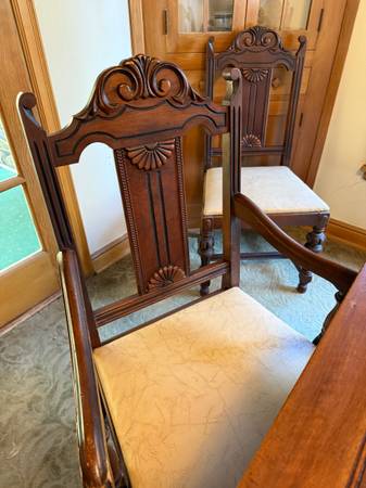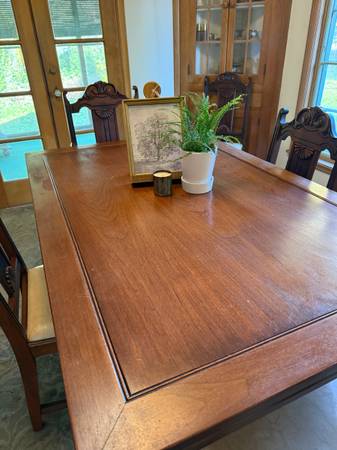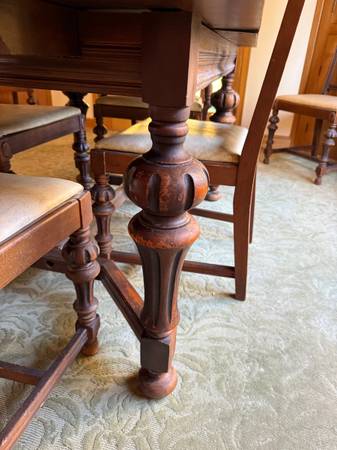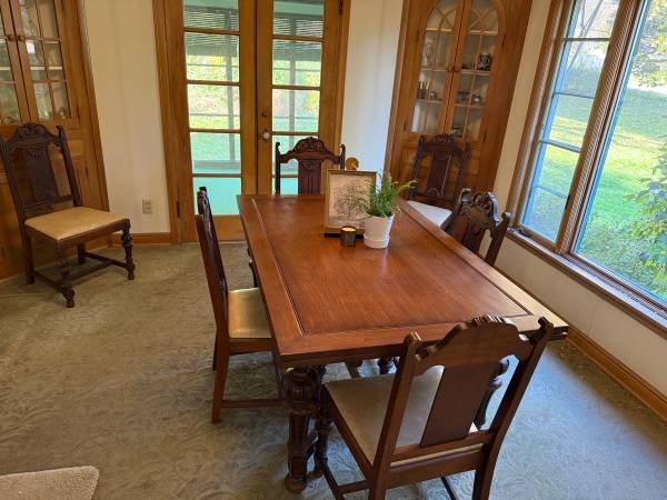 Solid wood MCM dining table with leaves that slide out on each end to lengthen the table. Comes with 6 chairs. Check out the legs on the chairs and table!😍 Wowza! Table is 60L x 38W as shown, and...