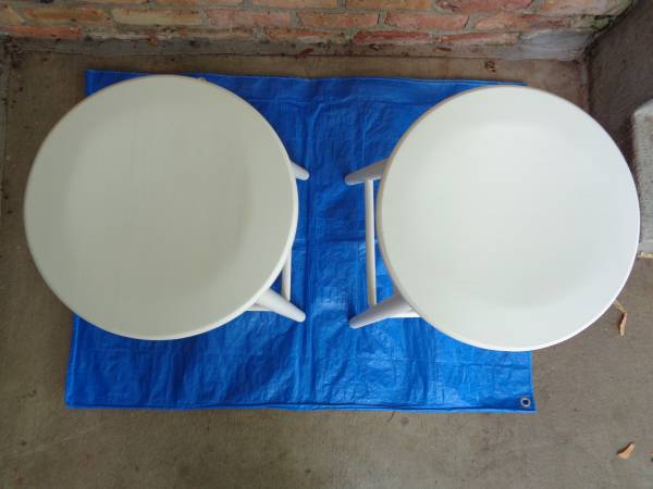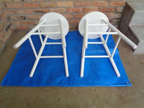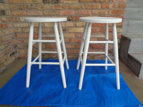 Pair of 24” Wood Bar Stools or Kitchen Stools or Counter Stools with XL Seats; quality construction--very solid and sturdy; extra-large 14” diameter seats; fresh coat of paint—light cream finish goes with many different decors; ideal for kitchen counters or bar areas; felt pads on feet; stools are 24" high and the seats are 14" in diameter; excellent condition