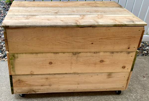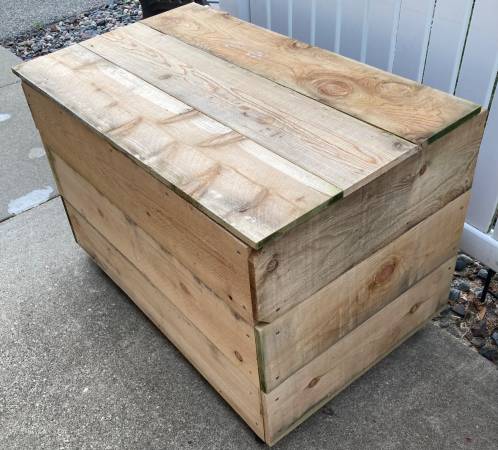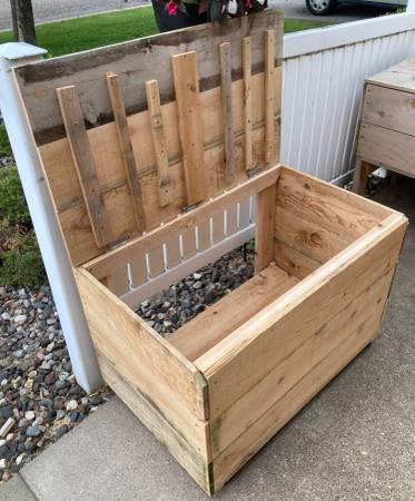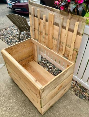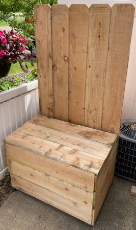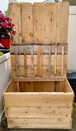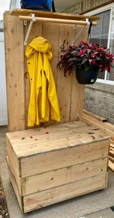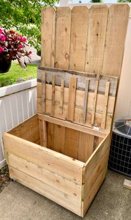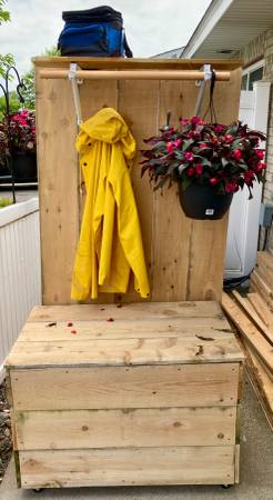 Versatile natural Cedar portable storage box with lid, tall backing and 2” locking casters. Approximate measurements are 38” long x 26” deep x 72” tall. Perfect for garage, porch, outdoor storage for toys, garden tools or ???. Dog eared picket fence back can be customized with hooks, shelving or your ideas. It is in 2 pieces for easy transport. Heavyweight, solid and sturdy. Last 2 pictures show some customizing of the back with coat hooks and hanging shelf rack. $150 with pick up in Lakeville.