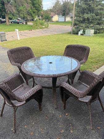 Selling a wicker patio set still in pretty good shape may need to repaint or leave as is. It has been a great patio set does come with cushions. Asking 250 or B/O