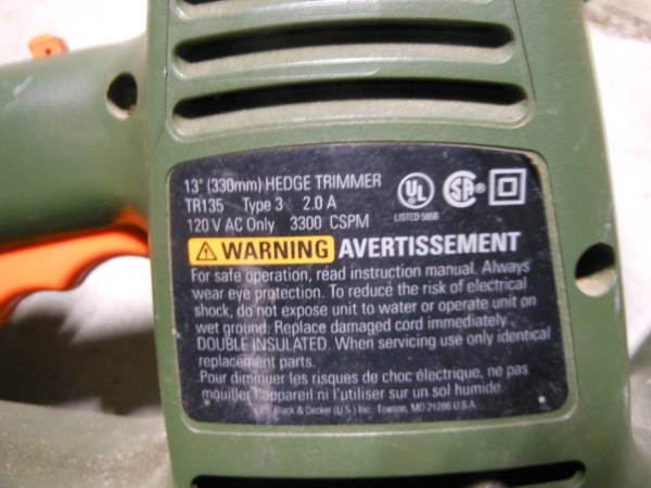 Black & Decker TR135, 13" hedge trimmer. Call Tim, , if you leave a message include your phone #. This is a landline, NO TEXTS or Emails.