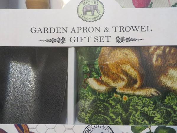 Michel Design Works Garden Apron & Trowel Gift Set, garden vegetable theme/motif. Trowel has laser engraved wood handle and a carbon stamping steel blade. Apron has one pocket with touch closure (perfect for cell phone) and five others for tools and supplies. Durable, washable cotton. Apron measures 25” X 15.5” and trowel measures 11.4” X 3.5”. Brand new in attractive gift box. $20