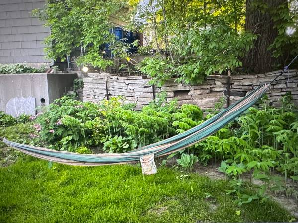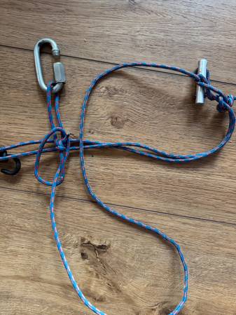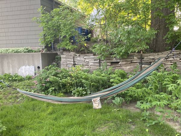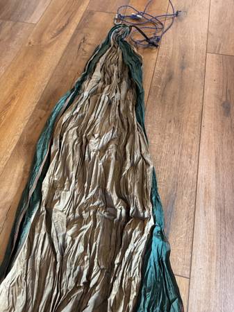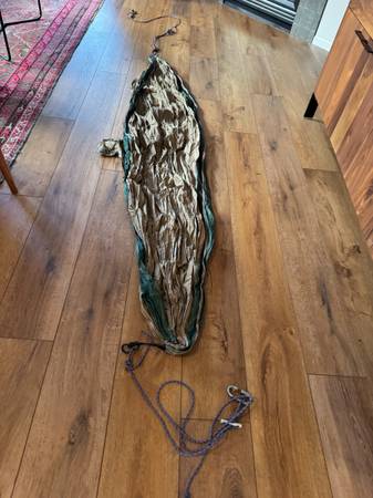 This large Hammock is in great condition. Slightly faded, but no visible tears, rips etc. I’m including the extra several feet of extra heavy duty cord / rope purchased from REI, as well as the heavy gauge clips that I used to attach to another clip I had nailed into my garage, and had the other end hooked on to a clothes line. (Seen in photos).