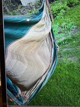 This large Hammock is in great condition. Slightly faded, but no visible tears, rips etc. I’m including the extra several feet of extra heavy duty cord / rope purchased from REI, as well as the heavy gauge clips that I used to attach to another clip I had nailed into my garage, and had the other end hooked on to a clothes line. (Seen in photos).