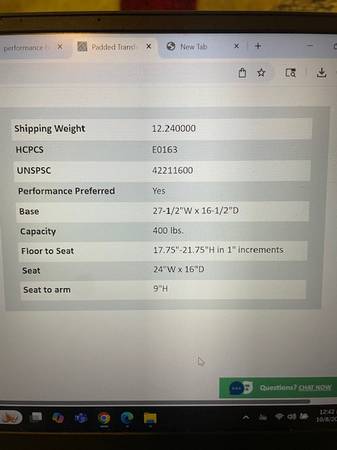 Floor to Seat 17.75"-21.75"H in 1" increments