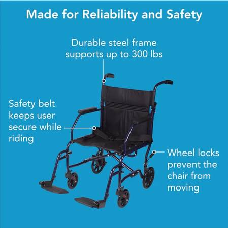 The sturdy steel frame of the transport chair provides full support during everyday transport and also folds easily for compact storage making this ultra lightweight wheelchair an excellent choice instead of a wheelchair rental. Some assembly required.