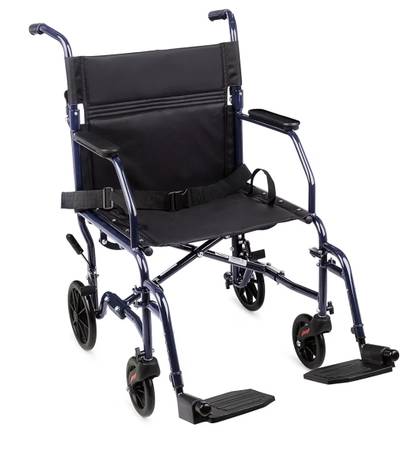 Transfer wheelchair folds up to fit into a trunk, a perfect medical transport chair for bringing someone home from the hospital. Transport wheelchair is great for those on the go or those in need of a folding companion wheelchair for occasional use.
