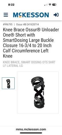 Ossur Unloader One Knee Brace, Short with SmartDosing large buckle closure. 16 3/4 to 20 inches calf circumference. Left leg, size Large. Like new, worn about 10 times. Cash, PayPal, or Venmo.