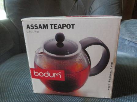 Bodum Assam Teapot, new in box--item number 1842. Teapot is about 8.4" x 8.2" x 7.4" and 17-ounce capacity. Pot is heat resistant borosilicate glass, infuser is stainless steel, handle and lid are BPA free plastic. Works like a coffee press, in which you can brew tea without removing the infuser. Made in Germany. I read that this was designed for the British Tea Council.