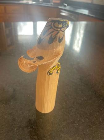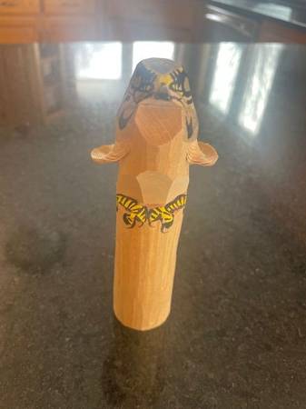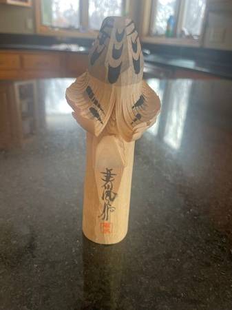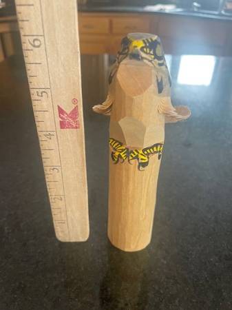 Sasanobori Japanese Wood Carving Hawk Bird from a smoke-free, pet-free home. This is a native art form of Japan called, "Sasanobori". It is carved with a single graver tool called a "Sarukiri" and the wood is from the Aburanko tree. It measures 4 3/4" x 1 5/8" x 2". The feathers are delicate chips of wood slices from the single piece of wood. The bird is hand painted with yellow and black colors. $25 cash only.