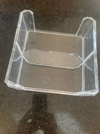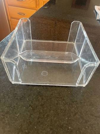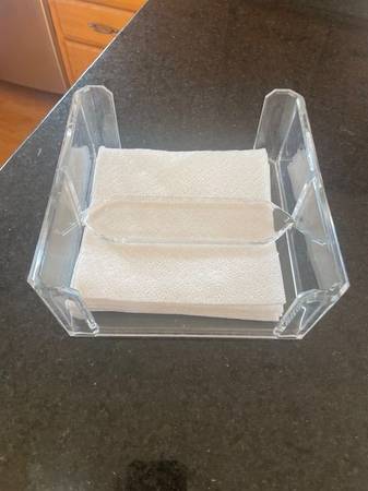 Square Napkin Holder from a smoke-free, pet-free home. Sturdy clear acrylic , 7 1/2 x 7 1/4, has hairline crack but is still very sturdy. $7 cash only.