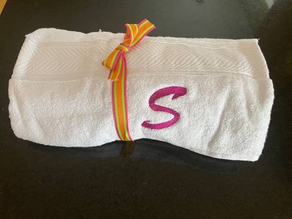 White Better Homes and Gardens Bath Towel with letter S in pink stitching. New from a smoke-free, pet-free home. Towel is 65 inches x 35 inches. Initial is 3 inches x 3 inches. $12 cash only.
