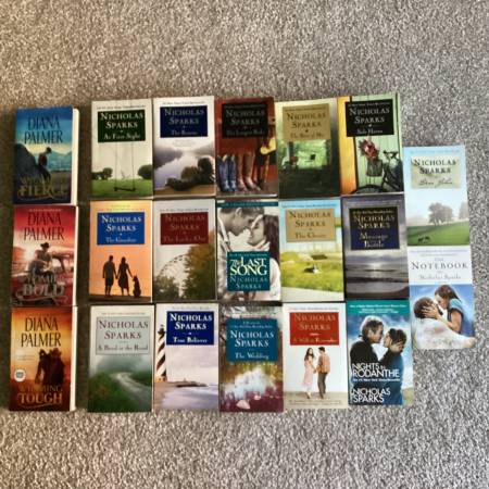 17 Nicholas Sparks paperback books and 3 Diana Palmer paperback books. All books are in excellent condition. No rips, stains, smoke free home. All have full covers and backs, and spines. Please see pictures for titles of the books. Eagan location for easy pickup.