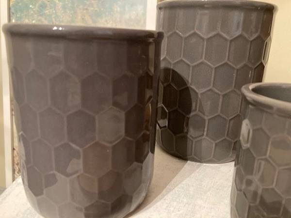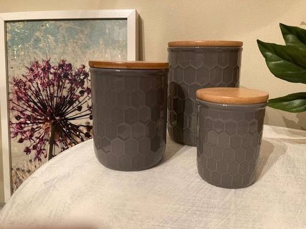 Grey Hexagon Honeycomb relief design Ceramic Canisters Sets with Bamboo Lids and airtight seal