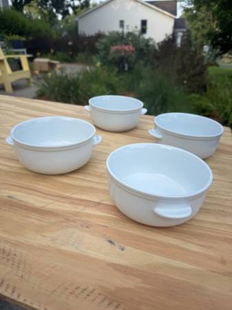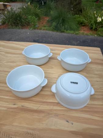 4 FITZ & FLOYD Bowls, Everyday White Double Handle. Micro & Oven...