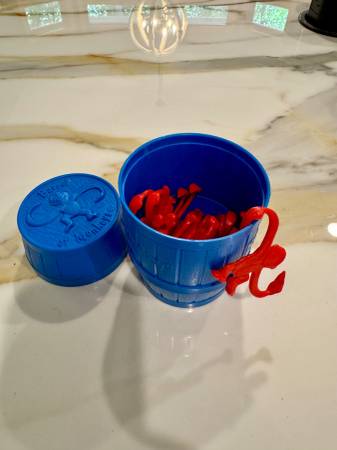 Barrel of Monkeys, specifically a vintage set with a blue barrel and 15 red monkeys.