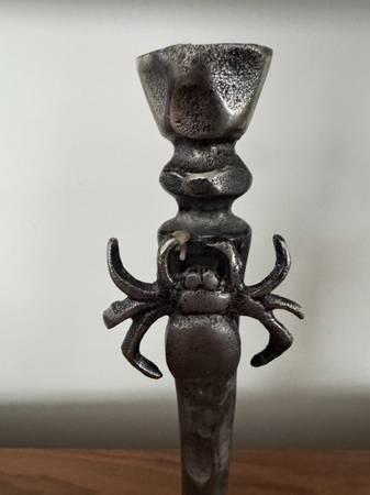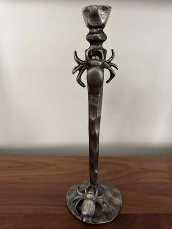 Scary candle holder with hammer3ed metal and two figural crawling spiders, one at the top and one at the bottom. They measure approximately 15” tall and the base is 5.5” diameter. Candle not included.