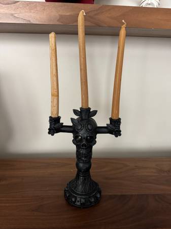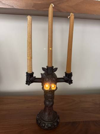 Black skull-shaped candle holder with floral and leaf details. Holds 3 Taper candles. Candles not included. Eyes light up. Battery included.