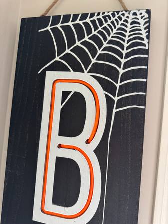 NEON ORANGE Lighted Indoor Outdoor “BOO” Sign See include "more ads by this user" link NEON ORANGE Indoor Outdoor “BOO” Sign Black wooden sign with spider web design. Jute corded hanger 47” L x 9.5”...