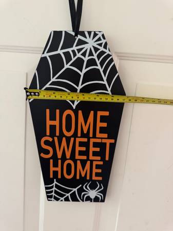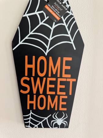 PLACE & TIME Coffin-shaped HOME SWEET HOME sign with spider web design. NWT include "more ads by this user" link PLACE & TIME HOME SWEET HOME Wall Décor Black, White, & Orange Spider...
