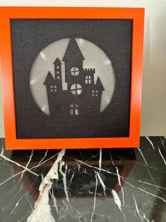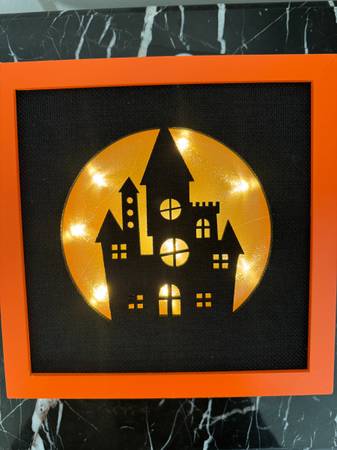 Framed Halloween-themed LED Light wall art with haunted house design. PLACE & TIME New