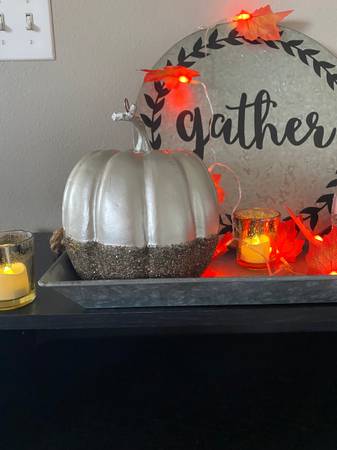 Price includes everything! Everything looks brand new.Silver tray with rope handles, which can be used time and time again, three votives, including candles, including flameless, candles, two contemporary pumpkins, light up, leaf, strand, and beautiful metal “gather “ sign that can also be hung in any gathering space. Pick up is less than five minutes from Kohls Apple Valley.