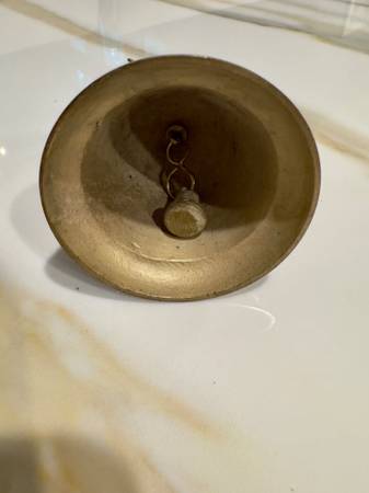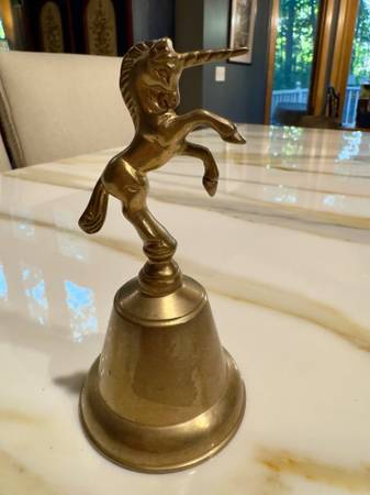 This vintage 70's brass unicorn bell is a delightful addition to any fantasy decor. This bell features a charming unicorn design, this handbell is sure to bring a touch of whimsy and magic to any space. Complete with a clapper for easy use, this unique piece is a perfect blend of nostalgia and enchantment.