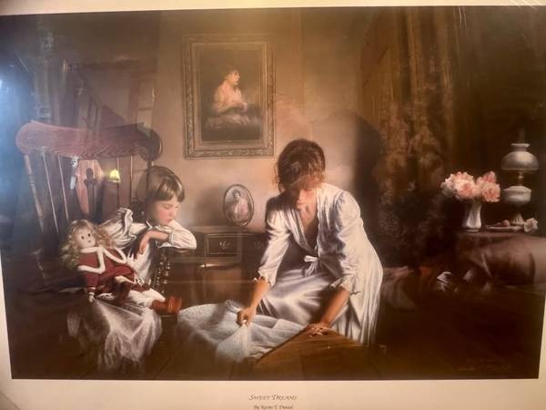 The scene depicts a mother putting the baby down for the night with the sister watching. The details in the print remind me of the classics with all the details in the background and the milk glass oil lantern and room divider.