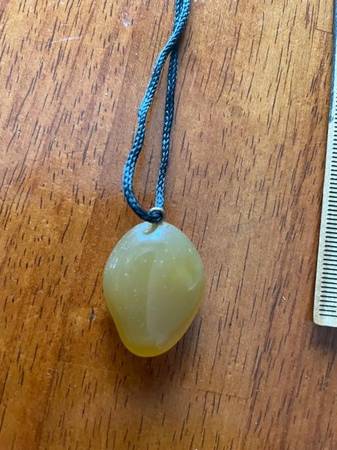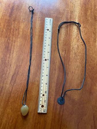 Kid Necklaces from a smoke-free, pet-free home. One is a shiny rock on a black string. The other is a a coin shaped charm with an adjustable string. $5 for both, cash only.
