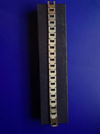 Unique link - nice feel - lays flat on the arm. Purchased at a jewelry store in AZ as a gift and then found that the recipient does not wear bracelets or necklaces. Ad will be removed if sold so no...