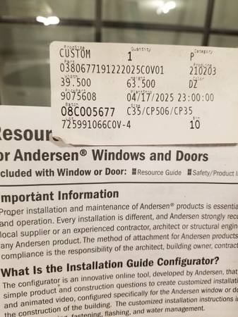 We are offering a newly manufactured Andersen 400 Series stationary window. As shown. This was installed, removed and replaced with Mama's choice. Pictures will show the measurements on the sticker. Exterior and interior pictures. The interior is still naked and ready for your stain choice.