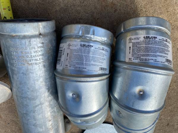 For sale 5 foot vent 45/60 and 90 degree elbows Vent cap The pipe and cap were installed but never used. The elbows are new. $35 Also have some other random fittings and a 7 1/2 foot drier vent...