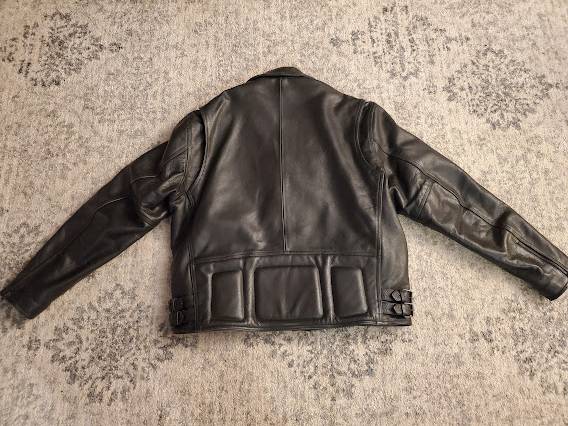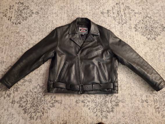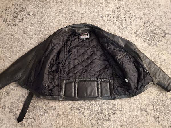 Perfect condition. Heavy full-grained leather exterior. Quilted polyester liner. Zippered sleeves. Three exterior pocket and interior pocket. Padded lower back. Double belt adjustable sides and...