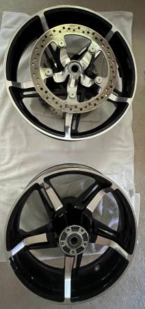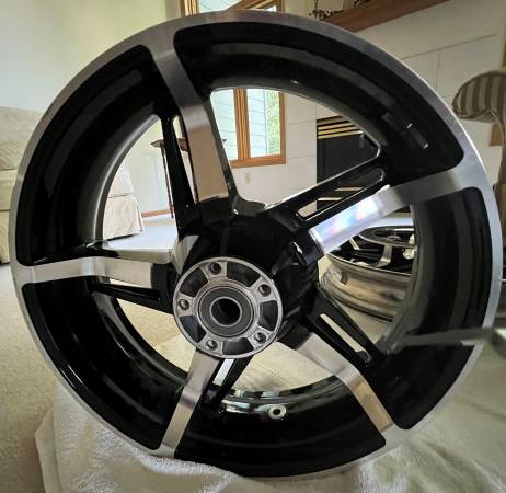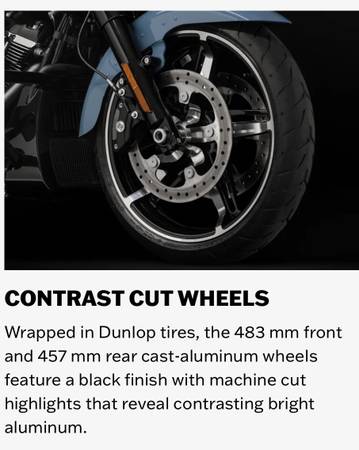 Front and Rear cast aluminum wheels, rims feature a black finish with machine cut highlights that reveal contrasting bright aluminum