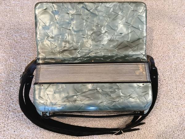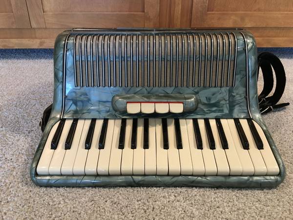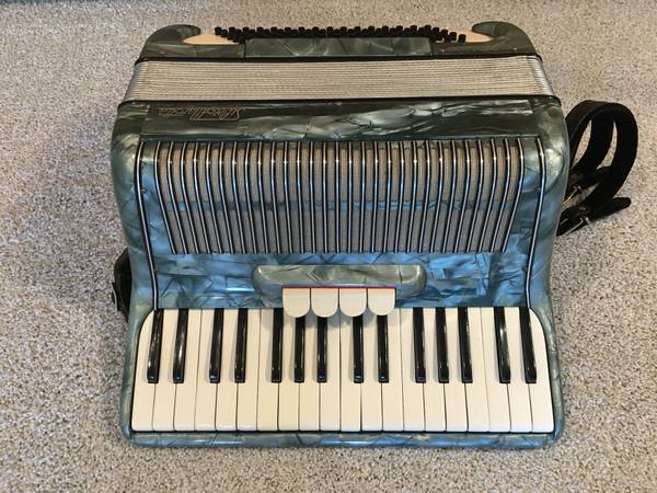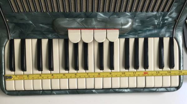 34 treble keys, 80 bass (Stradella style). Treble reeds are L-M-M (so you can select LM, LMM, MM, and M, with MM setting providing the pure musette sound, and LMM adding a note one octave lower to the musette sound.) Bass reeds are L-M (see left hand register switch in photos; toggles between M and LM) and the LM register has PLENTY of punch. In tune, in very good shape, nice and tight, and with a delightful musette. 16.5 pounds. Straps included. Located in Farmington.