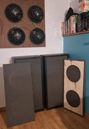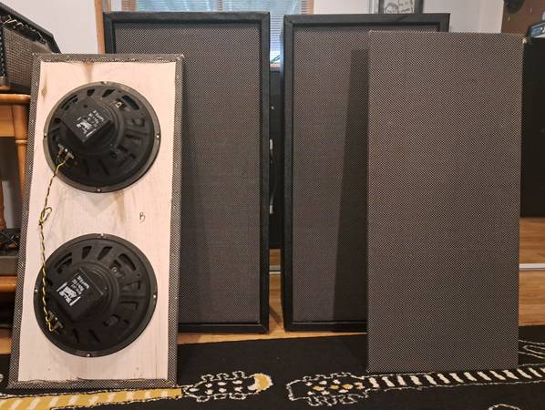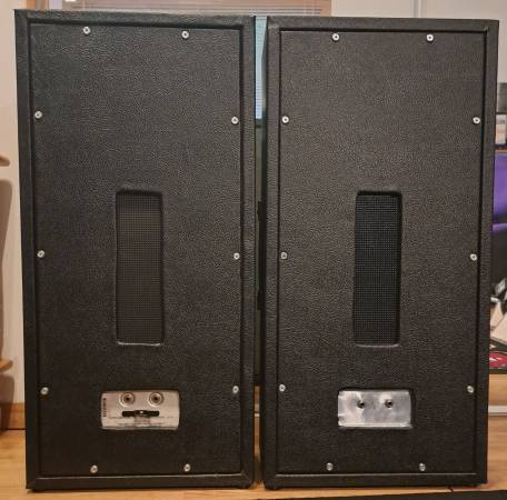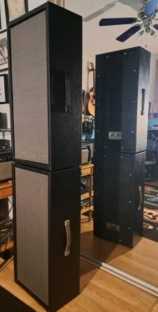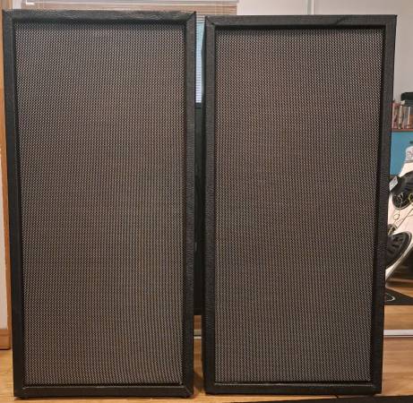 Pair of multi-function speaker cabinets for sale. These started as one Shure VA300-S column (two 10", four 8" speakers). Cut the cabinet in half (built like a tank!) and turned it into two cabinets (essentially a pair Shure VA301-S speakers which had one 10" and two 8" speakers). Rebuilt the cut-off endcaps with plywood, covered in new Tolex, retained the original baffles and built two more out of plywood, retained but modified the look of the back panel which has two screened openings and new grill cloth (as you may have noticed from my past vintage Kay and Heathkit amps, I'm partial to this gray grill cloth - so many people use the Fender silver which is boring and passe or the black Marshall that suggests there's something to hide). Pictures will show the details, but I'm selling the pair at three different price points: $175 for the pair with the 2x8, 1x10 speaker combo (8 ohms); $200 for the 2x8x10 speaker combo and empty 2x10 baffles with grill cloth; $250 for 2x8x10 and 2x10 with speakers (4 ohm). The original 8" and 10" Shure speakers are CTS dating to 1968/69, the four 10" speakers are square backed speakers made by CTS for a Peavey 4x10 column dating to 1976. Or make me a reasonable offer.