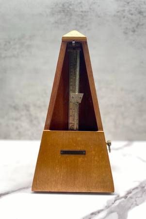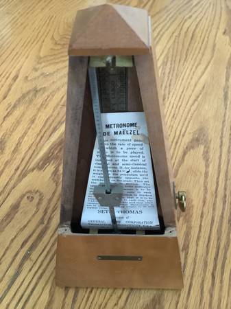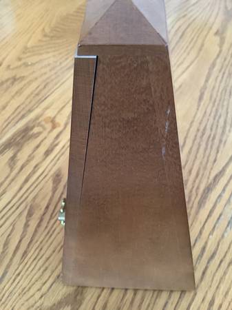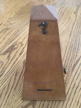 Seth Thomas metronome made of wood in brown color. It is 9" tall, 4.5" long and wide, with a mechanical mechanism. Suitable for piano, cello, violin, ukulele, banjo, and viola. Problems with the winding mechanism. Email with questions or to arrange a pickup time in Shakopee.