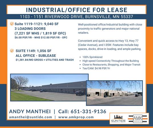 Well-positioned office/industrial building with close proximity to traffic generators and major national retailers. Convenient and quick access to Hwy 13, Hwy 77 (Cedar Avenue), and I-35W. Features include bay spaces, docks, drive-in loading, and ample parking.