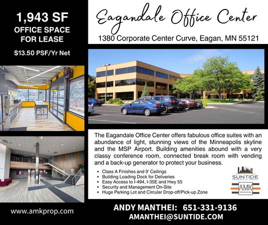 The Eagandale Office Building offers fabulous office suites with an abundance of light, stunning views of the Minneapolis skyline and the MSP Airport. Building amenities abound with a very classy conference room, connected break room with vending and a back-up generator to protect your business.