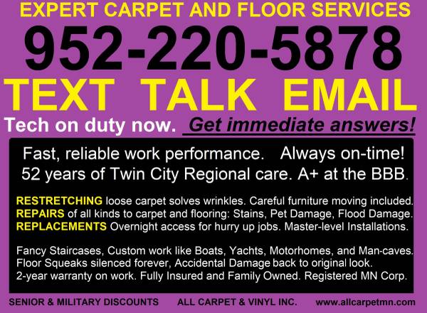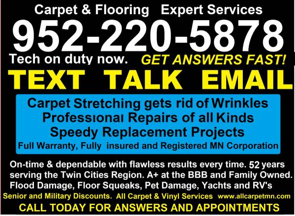 All kinds of carpet and flooring work done – Carpet restretching for wrinkle removal, includes furniture moving Carpet Replaced, Rips and Worn Spots Repaired, ratty carpet, ragged carpet doorway carpet damage damaged Frayed Carpet, Failed Metals, door metals Pet Damage, Urine, Mold and Stain Removal, Flood Recovery and mitigation, flooded carpet, carpet drying, carpet refit refitting Floor Squeaks, Burns, Holes, Spills, Custom work, Boats, RV's trailers hauling disposing Commercial Residential - you name it! Carpet restretch stretch restretching stretching repairing repairs wrinkles squeaks creaking creaks floor flooring installation installer floor installer floors floor cat damage puppy damage dog rodent bugs water mold mildew Installers install delivery binding serging edging wrinkles waves lumps raised burnt burn burns gouges hardwood laminate floating floor pergo luxury vinyl tile luxury vinyl plank wood floors stairs, baseboard installer, repair, repair floors, repairing floors, bamboo, hardwood, commercial residential contractor flooring contractor, staple down, nail down, engineered, glue together, glue down, sheet vinyl, linoleum, vinyl, base, trim installation, ceramic tile, LVT, LVP, vinyl glue, nail, nailed, wood tile, carpet patch, fix, engineered, floating, pad, sales, sale, Serving all 7 counties in the Twin City, Minneapolis St. Paul Bloomington Brooklyn Park Brooklyn Center Oakdale Fridley Savage Shoreview Plymouth Eagan Woodbury Maple Grove Coon Rapids Eden Prairie Burnsville Blaine Lakeville Minnetonka Apple Valley Elk River Chanhassen Prior Lake Crystal Rosemount Edina St. Louis Park Maplewood Shakopee Richfield Cottage Grove Inver Grove Heights Roseville Andover White Bear Lake Chaska Ramsey Champlin New Brighton Farmington Golden Valley New Hope Lino Lakes Columbia Heights Forest Lake Stacy Chisago Lindstrom Stillwater Hopkins Anoka St. Michael Buffulo Ham Lake Robbinsdale Otsego Hugo Monticello Vadnais Heights Moundsview East Bethel Mendota Heights Big Lake Little Canada Arden Hills Mound St. Anthony Cambridge Oak Grove Orono Shorewood St. Francis Cedar Albertville Spring Lake Park Minnetrista Nowthen. Minneapolis St. Paul and Surrounding Areas Including: Brooklyn Center Brooklyn Park Crystal New Hope Robinsdale Golden Valley St. Louis Park Hopkins Richfield Bloomington Minnetonka Plymouth Fridley Blaine Coon Rapids Anoka Moundsview Shoreview Arden Hill Roseville Lakeville, Apple Valley Rosemount Savage Prior Lake Eagan Eden Prairie Edina St. Louis Park Burnsville South Saint Paul Inver Grove Heights Mendota Heights Woodbury West St. Paul Shakopee West St. Paul, Minnetonka, Mound, Minnetrista, Chaska, south of the river, restretching stretching restretch, repair, carpet, vinyl install, patch spot fix urine repair Pet damage Fridley Maple Grove, Little Canada, White Bear Lake, Bloomington, Plymouth, Lake Minnetonka, Loretto Buffalo Rockford Delano Maple Plain Corcoran, St. Micheal Monticello St. Francis Andover Dayton Roseville Mahtemedi Woodbury Stillwater carpet wrinkles Afton Albertville Amery Andover Annandale Anoka Apple Valley Arlington Baldwin Balsam Lake Bay City Bayport Becker Belle Plaine Bethel Big Lake Blaine Bloomington Bock Braham Brook Park Brooklyn Center Brooklyn Park Buckman Buffalo Burnsville Cambridge Carver Castle Rock Cedar Center City Champlin Chanhassen Chaska Chisago City Circle Pines Clear Lake Clearwater Cokato Cologne Columbia Heights Columbus Coon Rapids Corcoran Cottage Grove Crystal Crystal Bay Cushing Dalbo Dayton Deer Park Delano Dresser Duluth Eagan East Bethel East Ellsworth Eden Prairie Edina Elk River Elko Elko New Market Ellsworth Excelsior Farmington Foley Forest Lake Foreston Fort Snelling Frederic Fridley Gaylord Gilman Glencoe Golden Valley Grandy Grantsburg Grasston Green Isle Hager City Ham Lake Hamburg Hamel Hammond Hampton Hanover Harris Hastings Henderson Henriette Hilltop Hopkins Houlton Howard Lake Hudson Hugo Inver Grove Heights Isanti Jordan Lake Elmo Lakeland Lakeville Lauderdale Lester Prairie Lexington Lindstrom Little Canada Long Lake Loretto Luck Mahtomedi Maiden Rock Maple Grove Maple Lake Maple Plain Maplewood Marine on Saint Croix Mayer Medina Mendota Mendota Heights Milaca Milltown Minneapolis Minnetonka Minnetonka Beach Minnetrista Monticello Montrose Mora Mound Mounds View Navarre New Auburn New Brighton New Germany New Hope New Market New Prague New Richmond Newport North Branch North Saint Paul Norwood Norwood Young America Oak Grove Oak Park Oakdale Ogilvie Osceola Osseo Pease Pine City Plato Plymouth Prescott Princeton Prior Lake Ramsey Red Wing Rice Richfield River Falls Roberts Rock Creek Rockford Rogers Rosemount Roseville Rush City Saint Anthony Saint Bonifacius Saint Cloud Saint Croix Falls Saint Francis Saint Joseph Saint Louis Park Saint Michael Saint Paul Saint Paul Park Saint Stephen Santiago Sartell Sauk Rapids Savage Scandia Shafer Shakopee Shoreview Shorewood Silver Creek Silver Lake Siren South Haven South Saint Paul South St. Paul Spring Lake Park Spring Park Spring Valley St Louis Park St Paul St. Cloud St. Louis Park St. Paul Stacy Stanchfield Star Prairie Stillwater Taylors Falls Tonka Bay Vadnais Heights Vermillion Victoria Waconia Waite Park Watertown Waverly Wayzata Webster Welch West Saint Paul White Bear Lake Willernie Winsted Woodbury Woodville Wyoming Young America Zimmerman Anoka County Carver County Chisago County Dakota County Hennepin County Isanti County Ramsey County Saint Croix County Scott County Sherburne County Sibley County Stearns County Washington County Wright County and others.