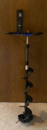 Assembled and ready to go. Just attach your drill. Light weight assembled. Perfect for jumping to different holes. Only used twice 8” drill ice auger Comes with: Strike master Lite-Flite lazer 8”...