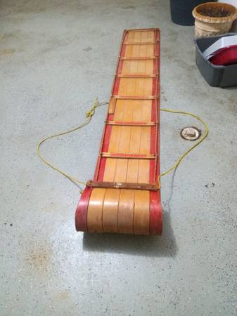 A nice toboggan primarily for display but you could use it on the slopes if you are brave. The front wood has a crack but otherwise it looks good. I don't have a cushion with it.