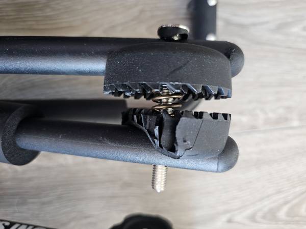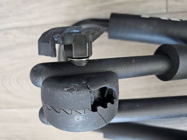 2 pieces damaged by apartment's garage door. MacGyver type could probably make usable. Nylon nut replaceable from company, but not entirely clamp unit.