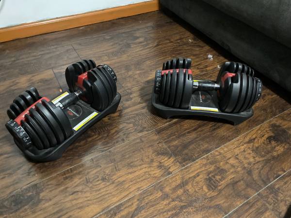 Pair of 52.5 lb adjustable Bowflex dumbbells. One dumbbell is missing one small plate. This only affects a few of the smaller settings, making it around 1.25 lbs lighter. The higher weight settings...